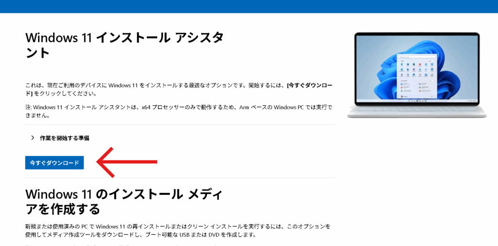 Windows 11 インストール アシスタントページにアクセスして「今すぐダウンロード」を押してダウンロードします。